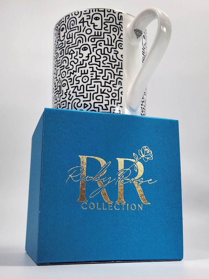 Experience refined elegance with our ‘Face Maze’ mug, crafted from the finest bone china. Delicately lightweight yet sophisticated, it features an intricate 'doodle art' inspired design highlighted with a genuine gold edge, adding a touch of modern luxury to every sip. Pair with our treat trays (sold separately) for an effortlessly elevated tea or coffee moment.